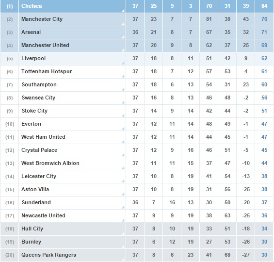 REPUBLIKA.CO.ID, LONDON--Kekalahan Chelsea 0-3 dari West Bromwich Albion pada Selasa (19/5) dini hari WIB tak mengubah posisi di klasemen Liga Primer Inggris. Chelsea tetap di puncak dengan nilai 84 sementara West Brom tak bergeser dari posisi ke-13 dengan nilai 44.