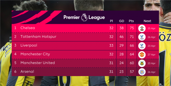 Klasemen papan atas Liga Primer Inggris. (Sumber: Twitter/@premierleague)