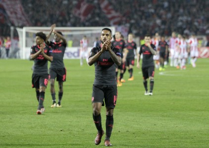 Pemain Arsenal Theo Walcott (tengah) memberikan apresiasi kepada suporter yang memenuhi Stadion Red Star, Belgrade, Serbia, Jumat (20/10). (EPA-EFE/Andrej Cukic)