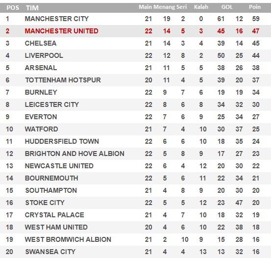 Klasemen sementara Liga Primer Inggris: