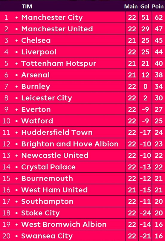 Klasemen sementara Liga Primer Inggris: