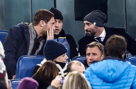 Pemain AS Roma Radja Nainggolan (tengah) bersama Monchi (kanan) dan mantan kapten Roma Francesco Totti menyaksikan laga Roma kontra Atalanta. (EPA-EFE/ANGELO CARCONI)