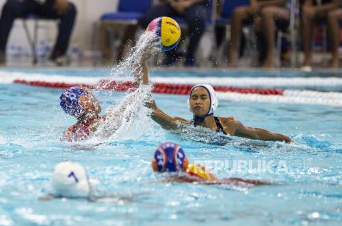 Atlet polo air putri Jawa Barat Aenah Aeliyah P (kanan) berusaha menghalau lemparan bola dari atlet polo air putri DKI Jakarta Ariel Dyah Cininta (kiri) saat pertandingan pada pertandingan Polo Air Putri PON Papua di Stadion Akuatik, Kampung Harapan, Kabupaten Jayapura, Papua, Senin (27/9/2021). Tim polo air putri DKI Jakarta mengalahkan tim polo air putri Jawa Barat dengan skor 10-7.