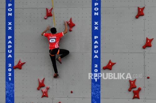 Atlet panjat tebing Kalimantan Barat Vedriq Leonardo beraksi pada final speed world record perorangan putra PON Papua di Arena Panjat Tebing SP 2, Kabupaten Mimika, Papua, Jumat (1/10/2021). Kalimantan Barat meraih medali emas dalam nomor speed world record perorangan putra dengan kecepatan 8,467 detik, sementara medali perak diraih Jawa Barat dan medali perunggu diraih Jawa Tengah.